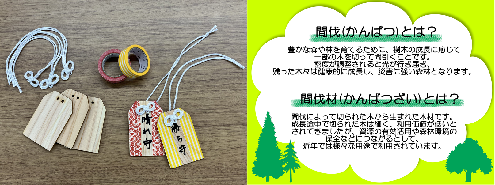 環境保全を意識する取り組みとして、ヒノキの間伐材を使ってオリジナルのお守りが作れるワークショップを開催いたします。