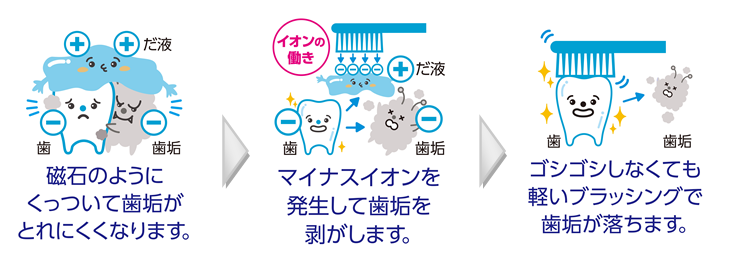 【マイナスイオン効果で歯垢を除去する仕組み】