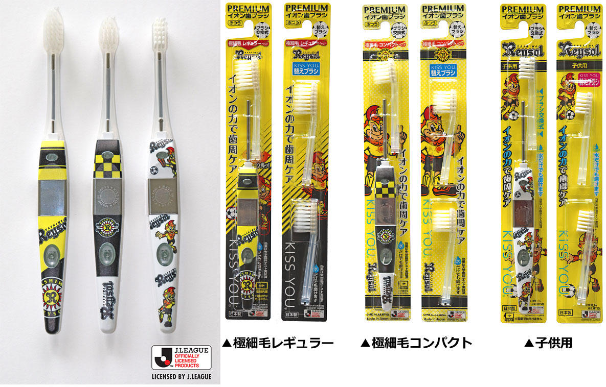 今回は「KISS YOU®」の中で最も人気の高い「極細毛レギュラーヘッド」をはじめ、「極細毛コンパクトヘッド」、「子供用」の3種類をご用意いたしました。また、柏レイソルオリジナルパッケージに入った替えブラシも同時に発売いたします。下記概要をご確認の上、この機会に是非お買い求め下さい。