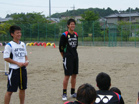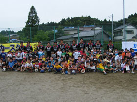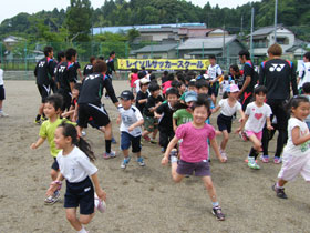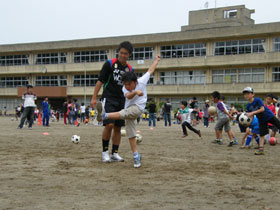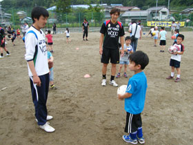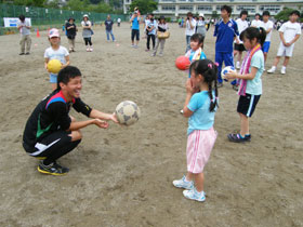 リフティングを指導する永井コーチに村上選手。やさしい指導に子どもたちが自然と集まります。