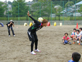 ジュンヤは得意のリフティングを披露。見たことがない技に子どもはビックリしていましたが、保護者の方たちからも大きな驚きの声が上がっていました。 |