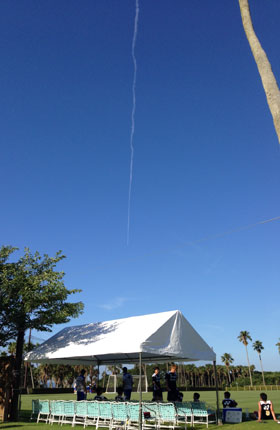 飛行機雲が地平線の方まで伸びていきます。