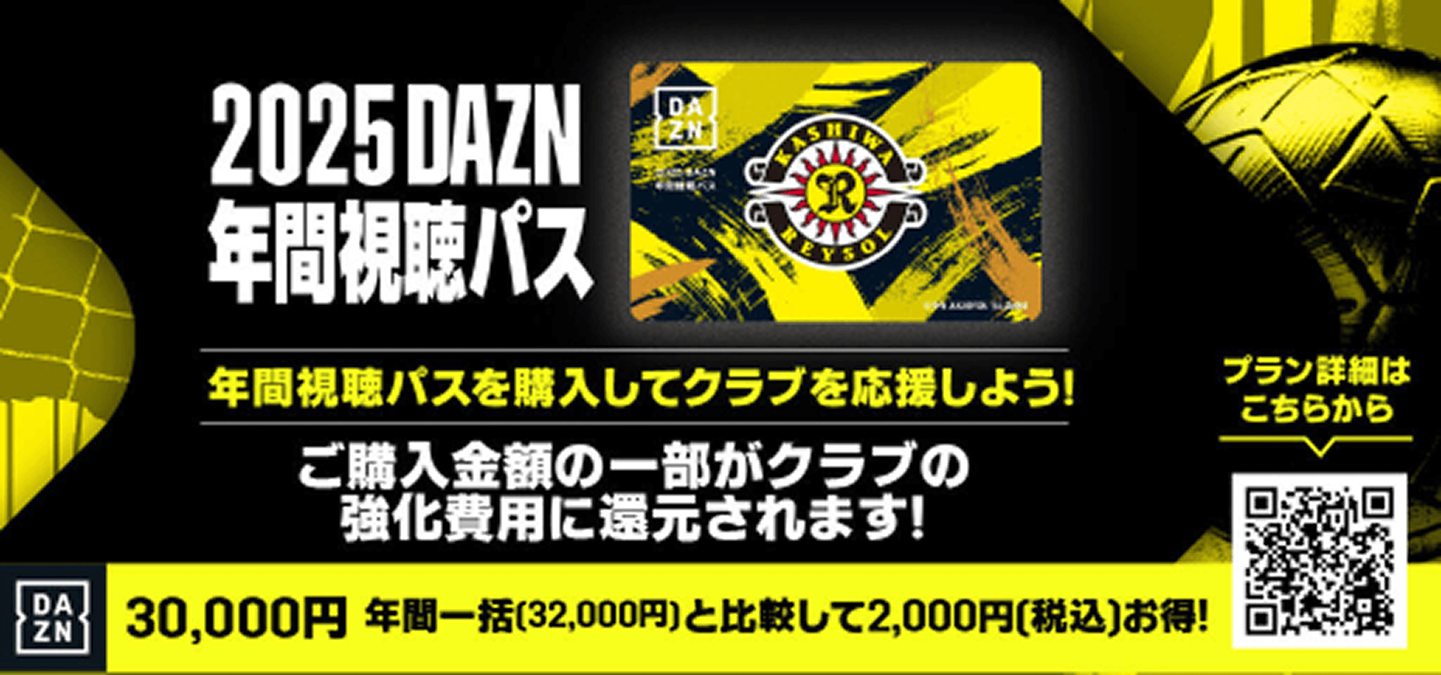 『2025DAZN年間視聴パス』の購入、または所定のリンクからご加入いただくと、視聴料金の一部がクラブ強化費に還元されます。