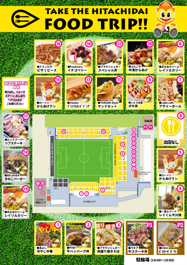 ※ビジターエリアならびに駐輪場エリアのスタジアムフードは場外に設置するため、ご利用の際は再入場が必要となります。