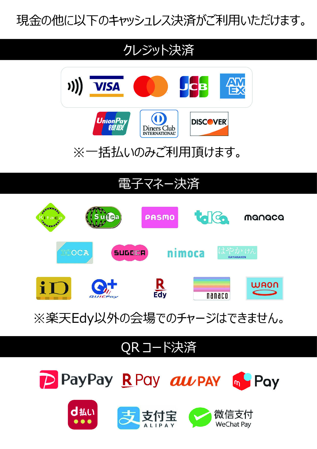 ※端末の電波状況により、クレジットカード決済や電子マネー決済がご利用できない場合がございます。その際は現金のみの対応となりますので、予めご了承ください。
