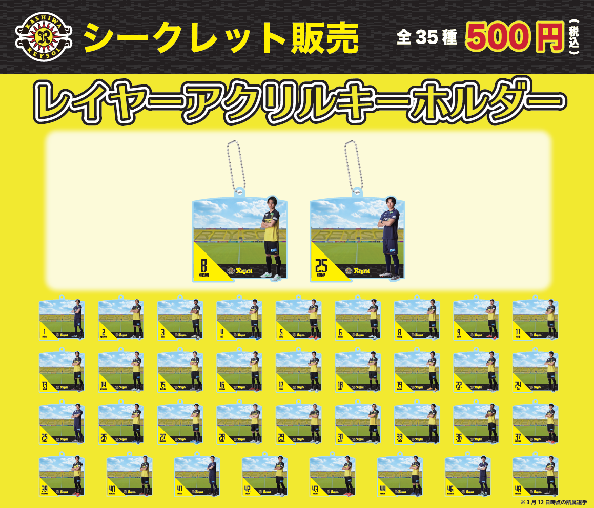 3月29日(土)に行われます明治安田J1リーグ第7節・東京ヴェルディ戦(14:00キックオフ、三協フロンテア柏スタジアム)にて、「レイヤーアクリルキーホルダー」の販売イベントを開催いたします。