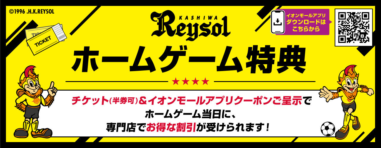柏レイソルのホームゲーム当日に、イオンモール柏の対象専門店にて、チケット半券(年間シートの方はICカード)とイオンモールアプリクーポンをご提示いただいた方にお得な特典がプレゼントされます。ぜひ、イオンモール柏にお立ち寄りください。