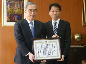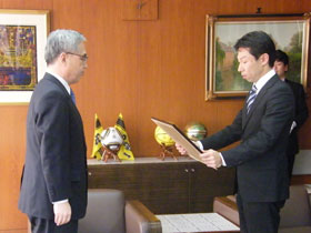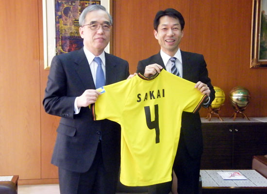 1月13日(金) このたび、柏レイソルが、柏市から『市民特別功労賞』を受賞することになり、1月13日に贈呈式が行われました。式典には秋山 浩保市長と、御手洗 尚樹代表取締役社長が出席し、賞状やトロフィーが授与されました。 |