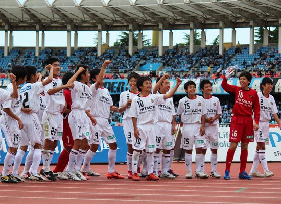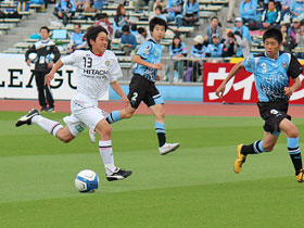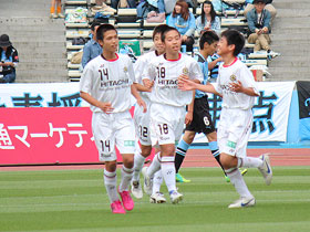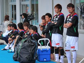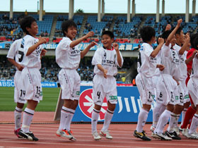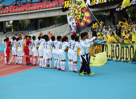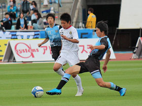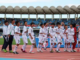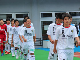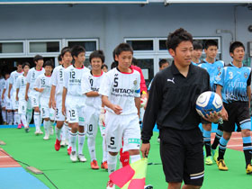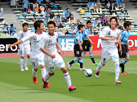 5月12日(土) J1川崎戦の前に、U-14チームによる交流試合が行われました。持ち前のパスワークで前半に八代選手と増田選手のゴールで2点を奪い、そのまま快勝!トップチームの試合に弾みをつける素晴らしいゲームを見せてくれました。 |