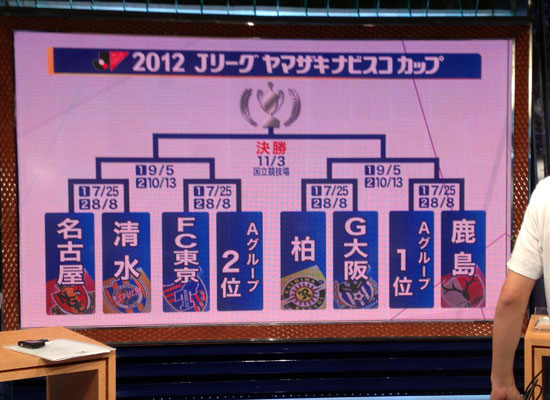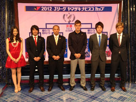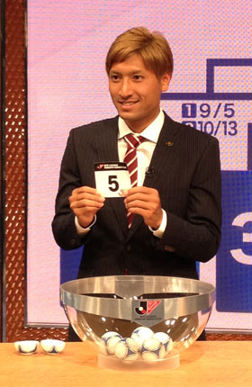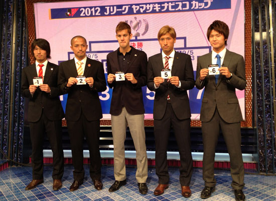 6月18日(月) フジテレビでおこなわれたヤマザキナビスコカップ決勝トーナメントの抽選会に、田中順也選手が参加。「5番」のくじを引き当て、ガンバ大阪との準々決勝が決定しました。7月25日の第1戦がアウェイ、8月8日の第2戦がホームでの対戦です。 |