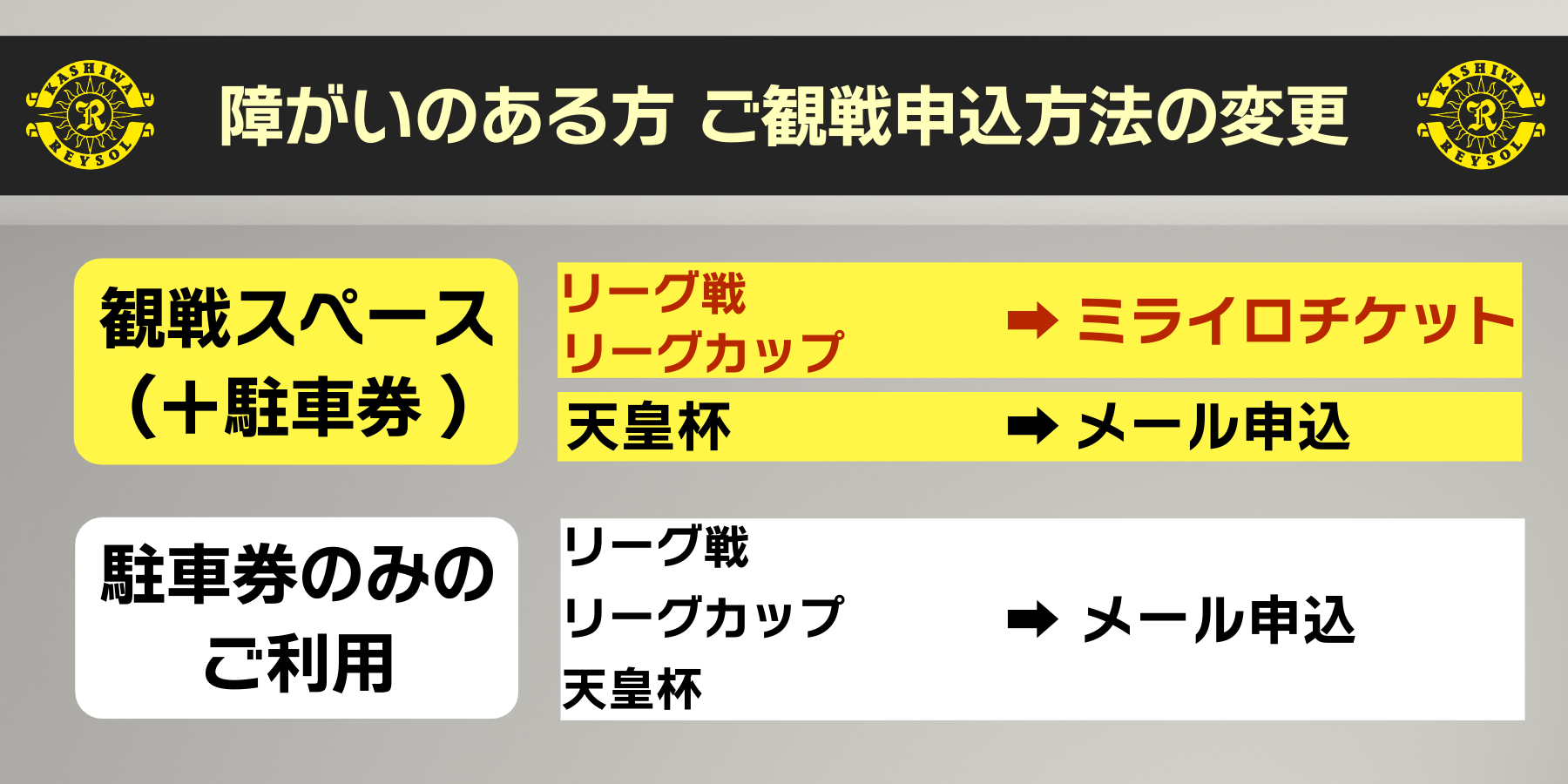 - ※連絡先:柏レイソル 運営部(受付時間:火~土曜、9:30~17:30)