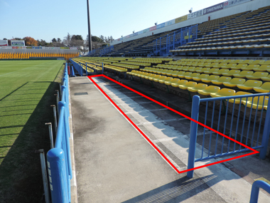 - ◆バックスタンド最前列の車椅子観戦エリアは他の最前列席と同様、よりサッカーを見やすくお楽しみいただけるよう、特別な防護ネット等はございません。ウォーミングアップ時および試合時等、客席にボールが飛び込む場合がございます。十分お気をつけいただきご観戦いただきますようお願い致します。