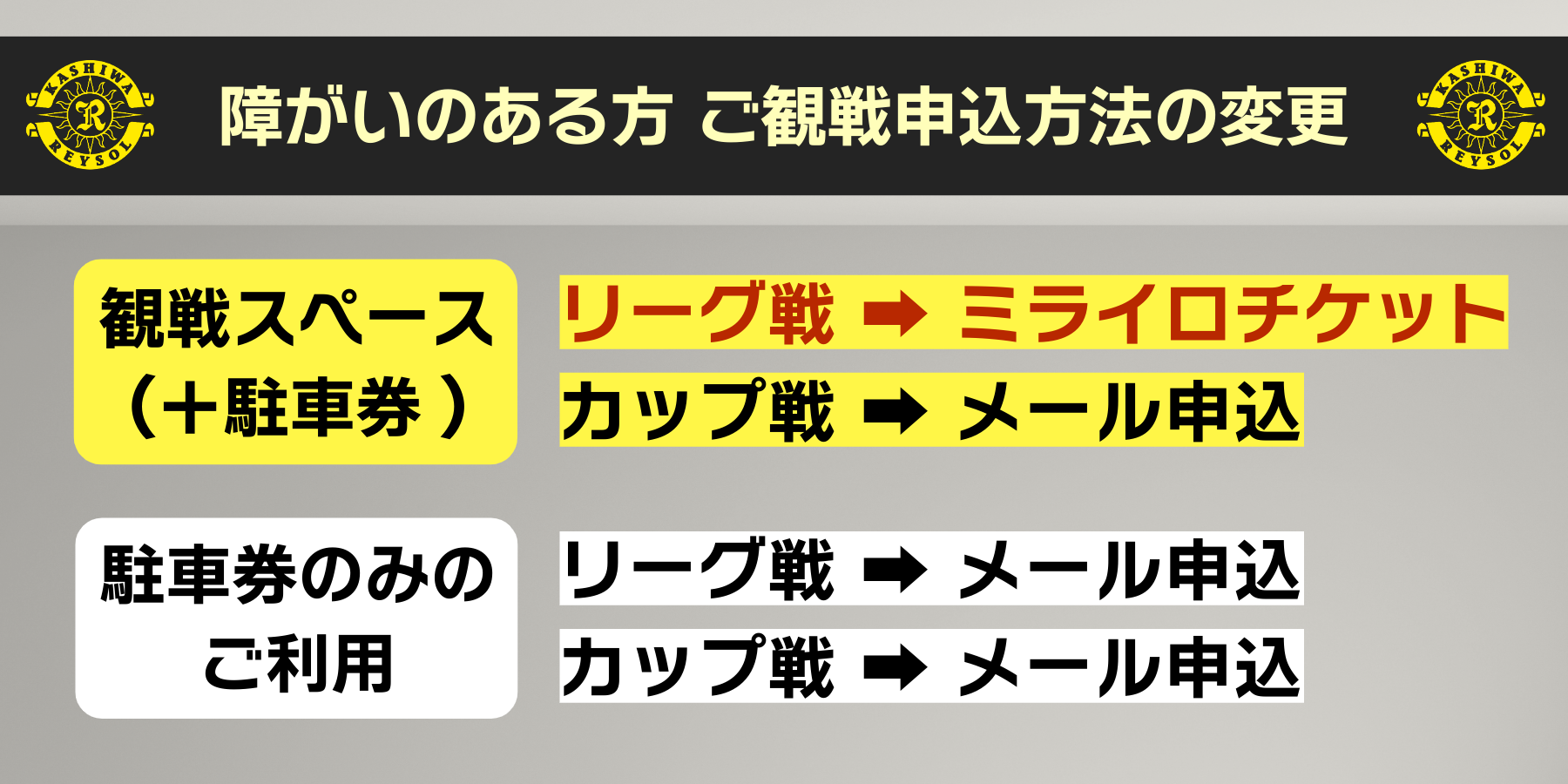 [1]柏レイソルまで「車椅子観戦エリア申込のメール(unei@reysol.hitachi.co.jp)」をお願いいたします。